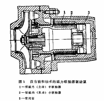 在煅燒設(shè)備回轉(zhuǎn)窯中的轉(zhuǎn)子和密封套之間存在偏心時,這正是由于存在于縫隙中不均衡的壓力所造成的,并且會因此產(chǎn)生能夠承受轉(zhuǎn)子重量的支撐力,這有可能促進(jìn)開發(fā)一系列回轉(zhuǎn)窯生產(chǎn)用帶有磁力聯(lián)軸器而無軸和軸承的泵,使得設(shè)計方面得到大大地簡化。其結(jié)構(gòu)如圖所示: