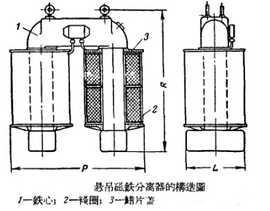 球磨機運轉(zhuǎn)中所用的懸吊磁鐵分離器則主要由一些馬蹄形的鐵心構(gòu)成,其上繞有線圈,而下段裝有的端部。經(jīng)過此設備分離出來的金屬塊會在人工作用除去,具體結(jié)構(gòu)如下: